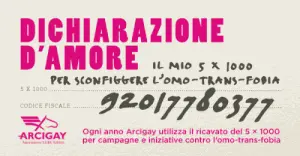 Dichiarazione d’amore, di coraggio, di libertà: il tuo cinque per mille all’Arcigay L’omotransfobia è uno dei grandi nodi irrisolti del nostro Paese: sulle vite delle persone omosessuali e trans, in Italia, si gioca da anni una partita torbida, fatta di molte promesse mancate, baratti, silenzi ipocriti, collateralità evidenti e prepotenti censure. Il “nulla di fatto” …