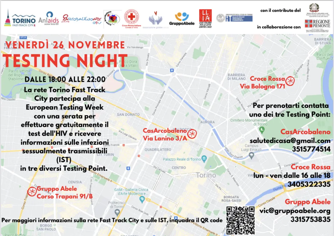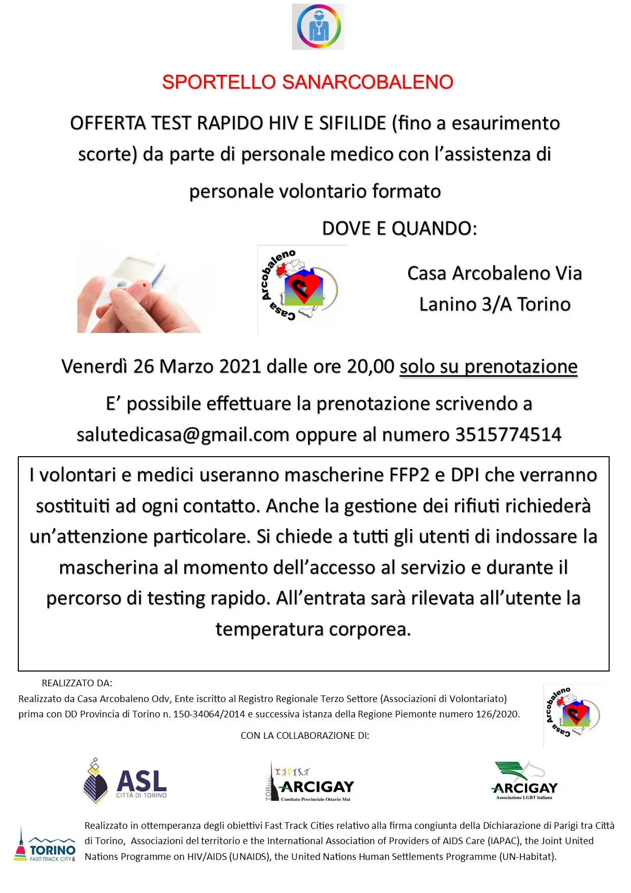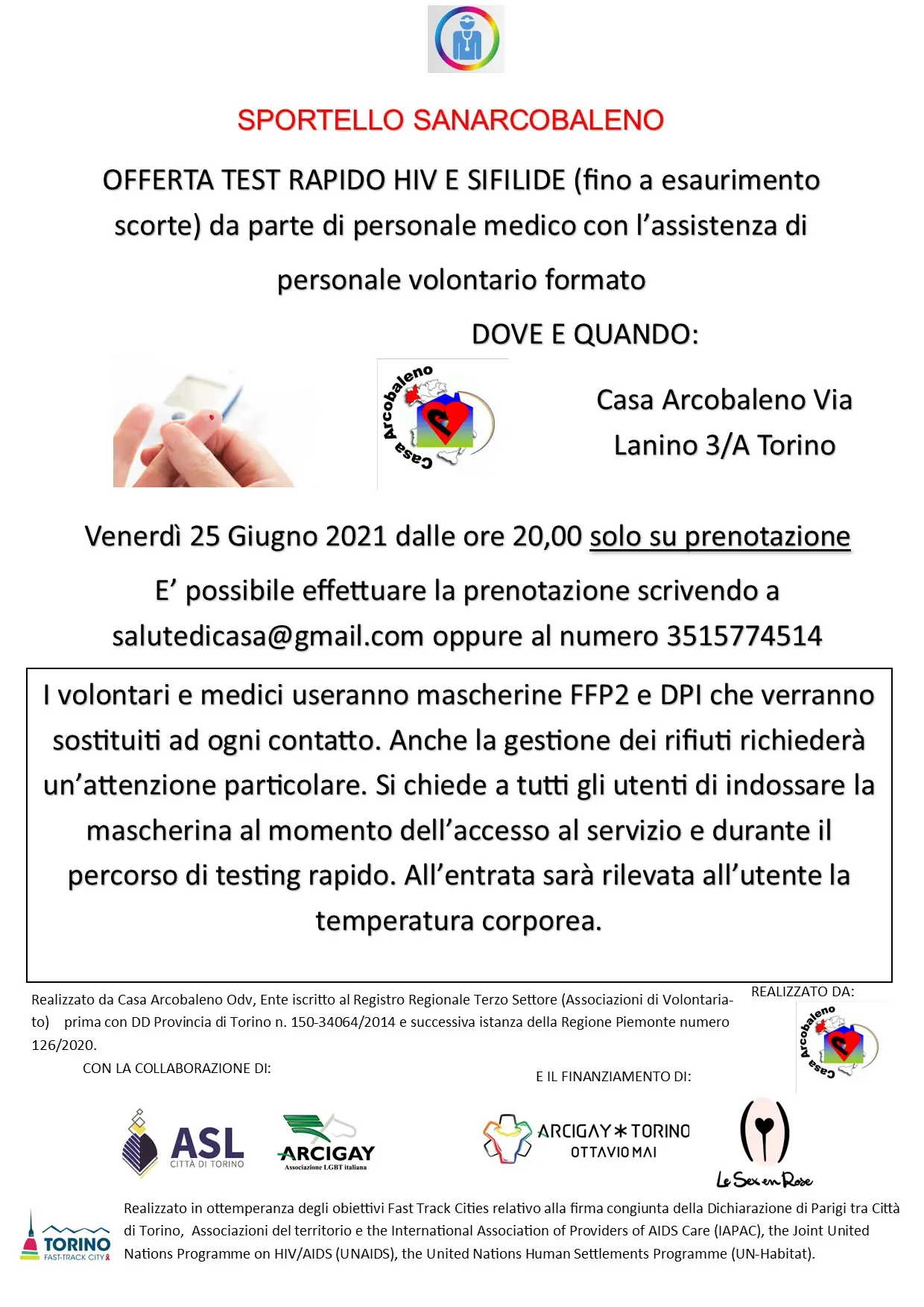 Venerdì 26 Novembre 2021 dalle ore 18 alle ore 22 presso tre sedi associative (Gruppo Abele, Corso Trapani 91/B Torino e-mail: vic@gruppoabele.org cellulare 3315753835; Casa Arcobaleno, Via Lanino 3/A e-mail: salutedicasa@gmail.com cellulare 3515774514; Croce Rossa Italiana – Comitato di Torino, Via Bologna 171 telefono 3405322335 per contatto telefonico in settimana dalle ore 16 alle 18) sarà possibile accedere al test rapido HIV. L’accesso sarà gratuito previa prenotazione telefonica o via e-mail. In 20 minuti si potrà ottenere il risultato del test. Il servizio è gestito e erogato da volontari appositamente formati e da personale medico e garantisce in caso di positività al test la presa in carico da parte dell’Ospedale Amedeo di Savoia di Torino.
