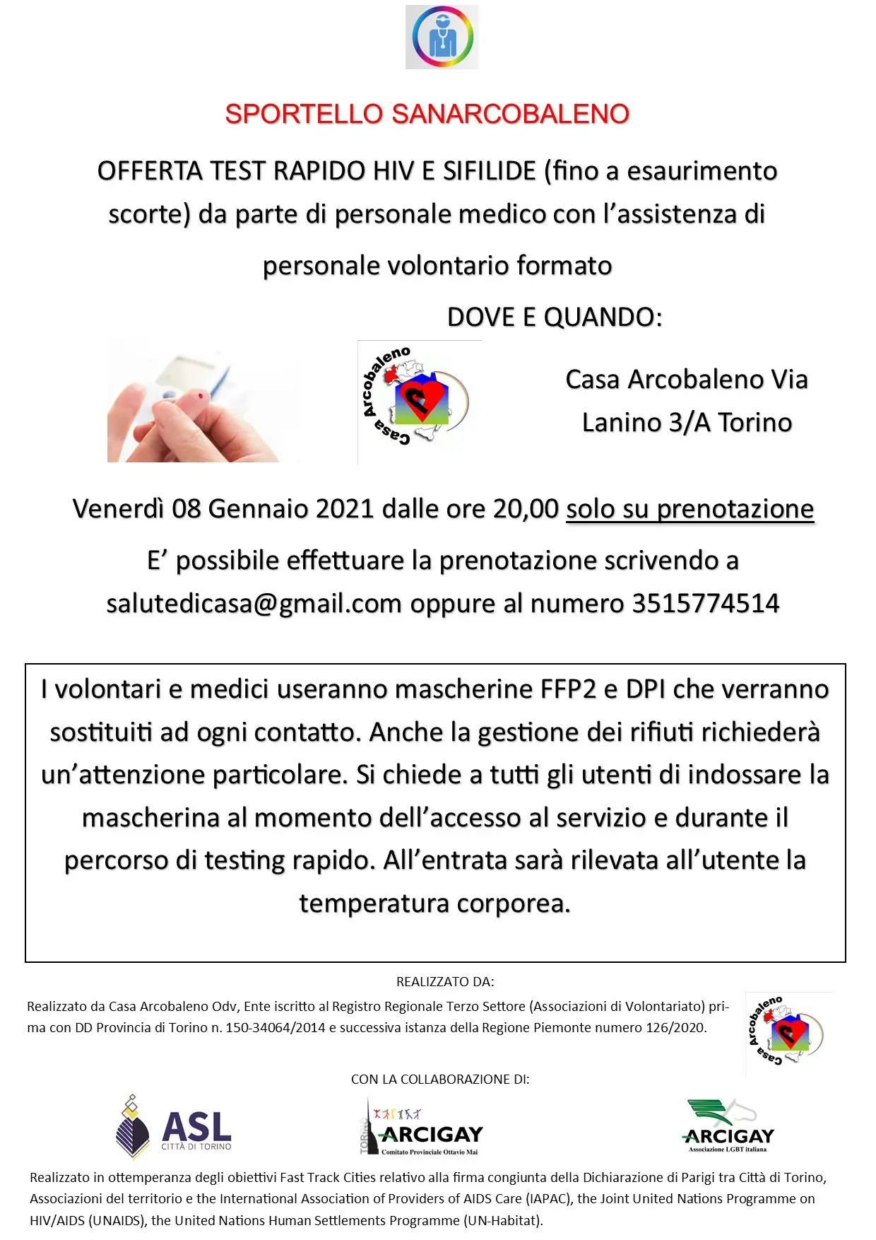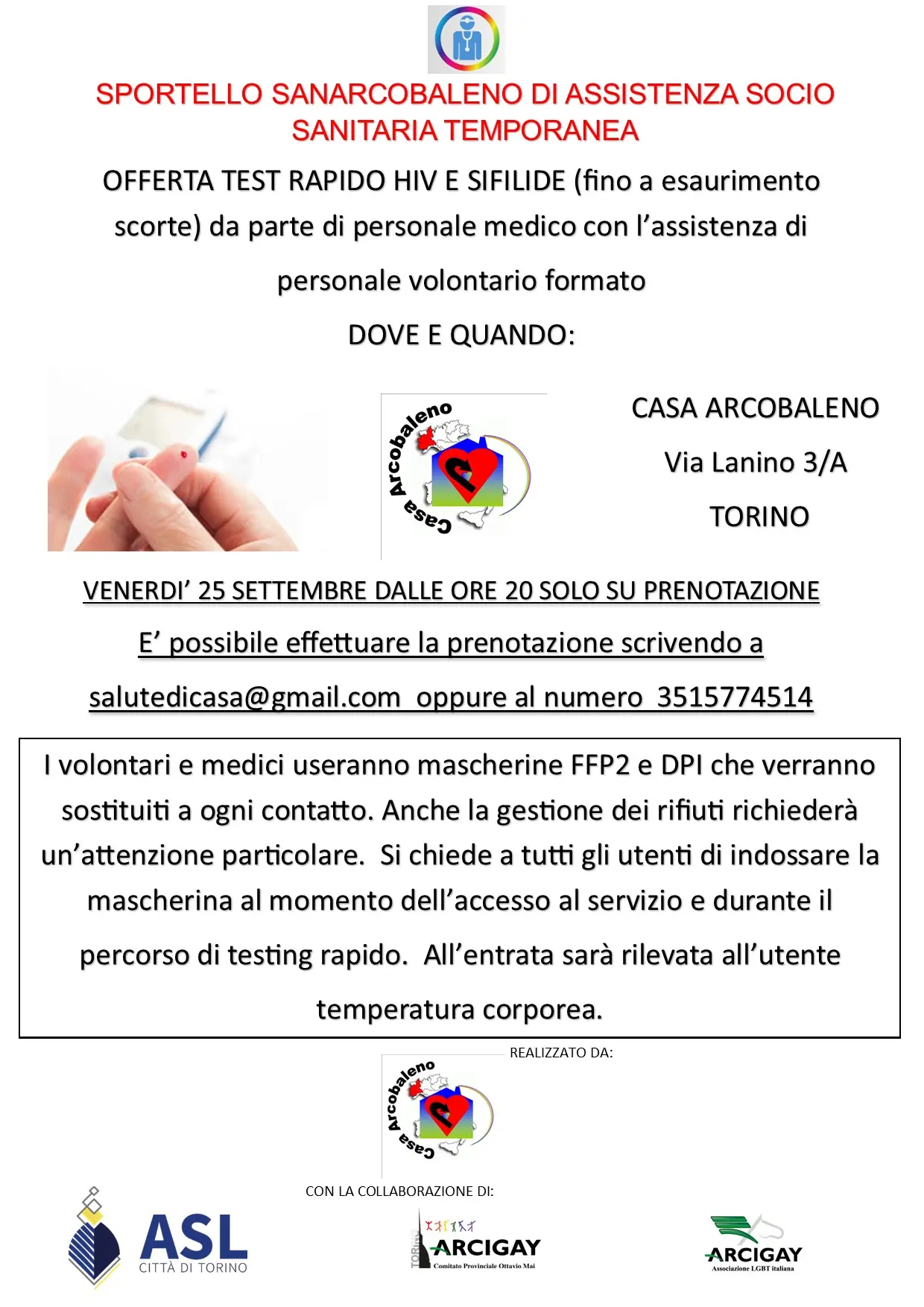 Venerdì 29 Maggio dalle ore 20 in avanti fino a esaurimento prenotazioni sarà possibile effettuare il test HIV e sifilide a risposta rapida presso la sede operativa dell’Associazione Odv Casa Arcobaleno in Via Lanino 3/A Torino. Il presidente dell’Associazione, Valerio Brescia dichiara: “è ora di ripartire con le attività di prevenzione che da anni forniamo con continuità al cittadino, sebbene sia più complicato garantire l’accesso diretto, cercheremo di fare il possibile per continuare un servizio che oramai fa parte del DNA dei cittadini e dei soci che popolano Casa Arcobaleno; quando le strutture sanitarie sono in difficoltà il volontariato deve essere più attivo e reattivo”. Il consueto appuntamento dell’ultimo venerdì del mese quindi riprende con alcune accortezze. E’ possibile contattare il numero 3515774514 o mandare una e-mail a salutedicasa@gmail.com per poter definire l’orario di accesso al test rapido HIV e sifilide con i volontari nella serata di venerdì. Ogni accesso prevede un’attesa di 20 minuti prima del risultato durante il quale i volontari e i medici svolgeranno attività informativa e preventiva basato su un questionario di risk-assessment volto a mappare i comportamenti a rischio avuti nel periodo precedente ai test. Il Direttore Sanitario, Dr. Stefano Costa afferma: “sono state adottate tutte le linee guida per tutelare volontari e utenti al servizio seguendo le linee guida fornite da DPCM e dal rapporto ISS COVID-19). All’ingresso della struttura sarà misurata la temperatura corporea con termometro infrarossi, nella struttura sarà garantito un ricambio d’aria, gli utenti potranno accedere due alla volta, e tutti gli ambienti saranno sanificati tra il passaggio di un utente e l’altro. Inoltre, volontari e medici useranno mascherine FFP2 e DPI che verranno sostituiti a ogni contatto. Anche la gestione dei rifiuti richiederà un’attenzione particolare. Si chiede a tutti gli utenti di indossare la mascherina al momento dell’accesso al servizio e durante il percorso di testing rapido.