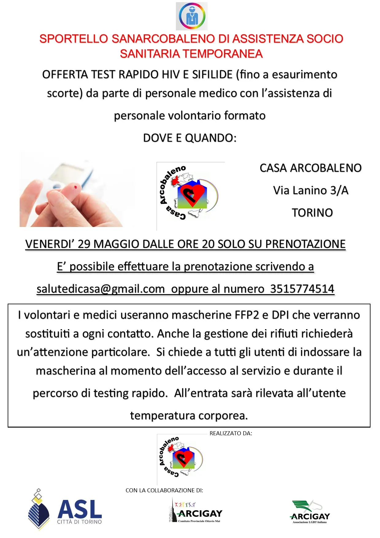 Venerdì 29 Maggio dalle ore 20 in avanti fino a esaurimento prenotazioni sarà possibile effettuare il test HIV e sifilide a risposta rapida presso la sede operativa dell’Associazione Odv Casa Arcobaleno in Via Lanino 3/A Torino. Il presidente dell’Associazione, Valerio Brescia dichiara: “è ora di ripartire con le attività di prevenzione che da anni forniamo con continuità al cittadino, sebbene sia più complicato garantire l’accesso diretto, cercheremo di fare il possibile per continuare un servizio che oramai fa parte del DNA dei cittadini e dei soci che popolano Casa Arcobaleno; quando le strutture sanitarie sono in difficoltà il volontariato deve essere più attivo e reattivo”. Il consueto appuntamento dell’ultimo venerdì del mese quindi riprende con alcune accortezze. E’ possibile contattare il numero 3515774514 o mandare una e-mail a salutedicasa@gmail.com per poter definire l’orario di accesso al test rapido HIV e sifilide con i volontari nella serata di venerdì. Ogni accesso prevede un’attesa di 20 minuti prima del risultato durante il quale i volontari e i medici svolgeranno attività informativa e preventiva basato su un questionario di risk-assessment volto a mappare i comportamenti a rischio avuti nel periodo precedente ai test. Il Direttore Sanitario, Dr. Stefano Costa afferma: “sono state adottate tutte le linee guida per tutelare volontari e utenti al servizio seguendo le linee guida fornite da DPCM e dal rapporto ISS COVID-19). All’ingresso della struttura sarà misurata la temperatura corporea con termometro infrarossi, nella struttura sarà garantito un ricambio d’aria, gli utenti potranno accedere due alla volta, e tutti gli ambienti saranno sanificati tra il passaggio di un utente e l’altro. Inoltre, volontari e medici useranno mascherine FFP2 e DPI che verranno sostituiti a ogni contatto. Anche la gestione dei rifiuti richiederà un’attenzione particolare. Si chiede a tutti gli utenti di indossare la mascherina al momento dell’accesso al servizio e durante il percorso di testing rapido.